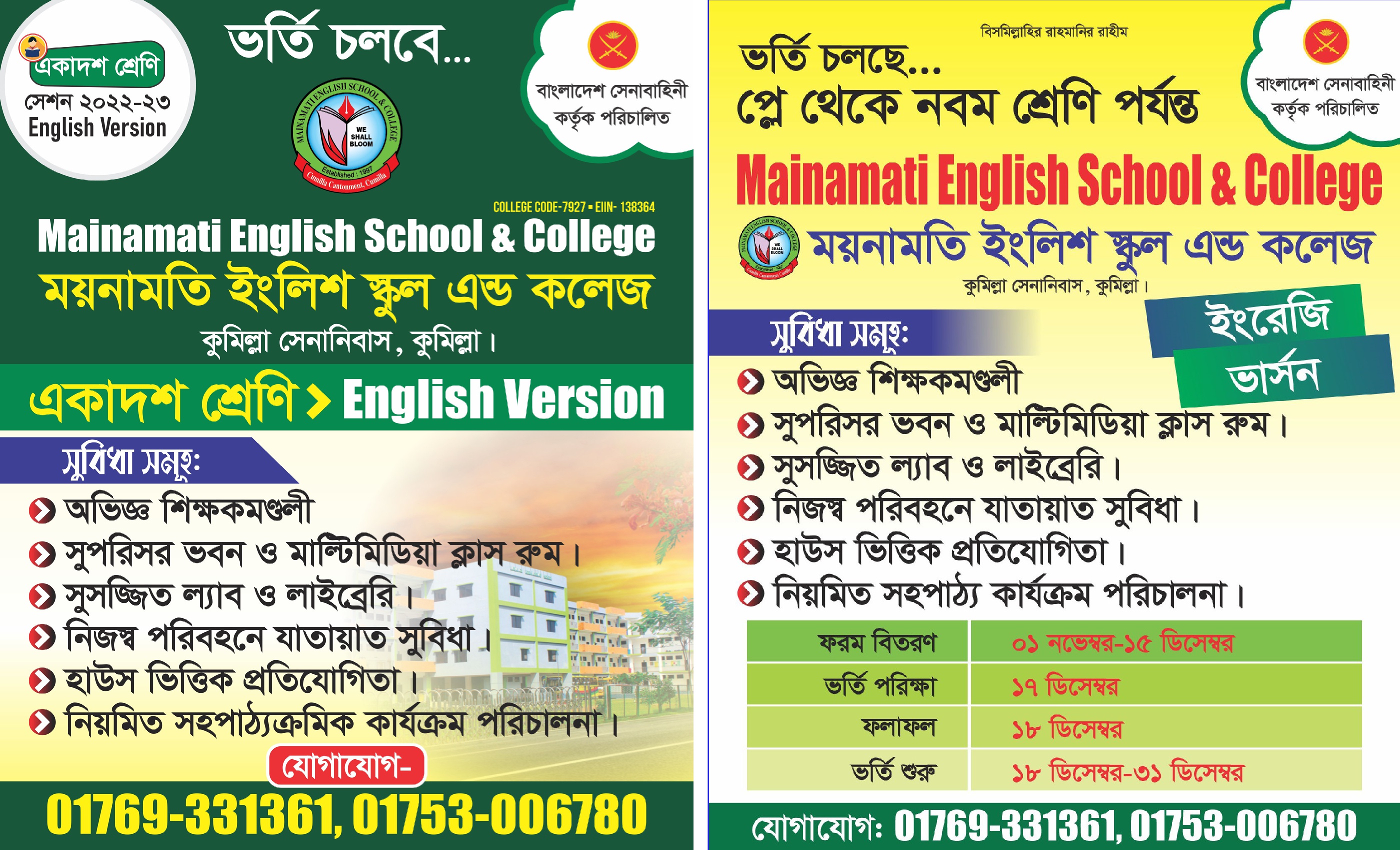 Mainamati English School & College in short MESC, an English Version School & College, is located at Cumilla Cantonment. It started its journey in the year 1997 and was housed in Honeymoon Lodge building at Shahid Serajul Islam Road.. Read more